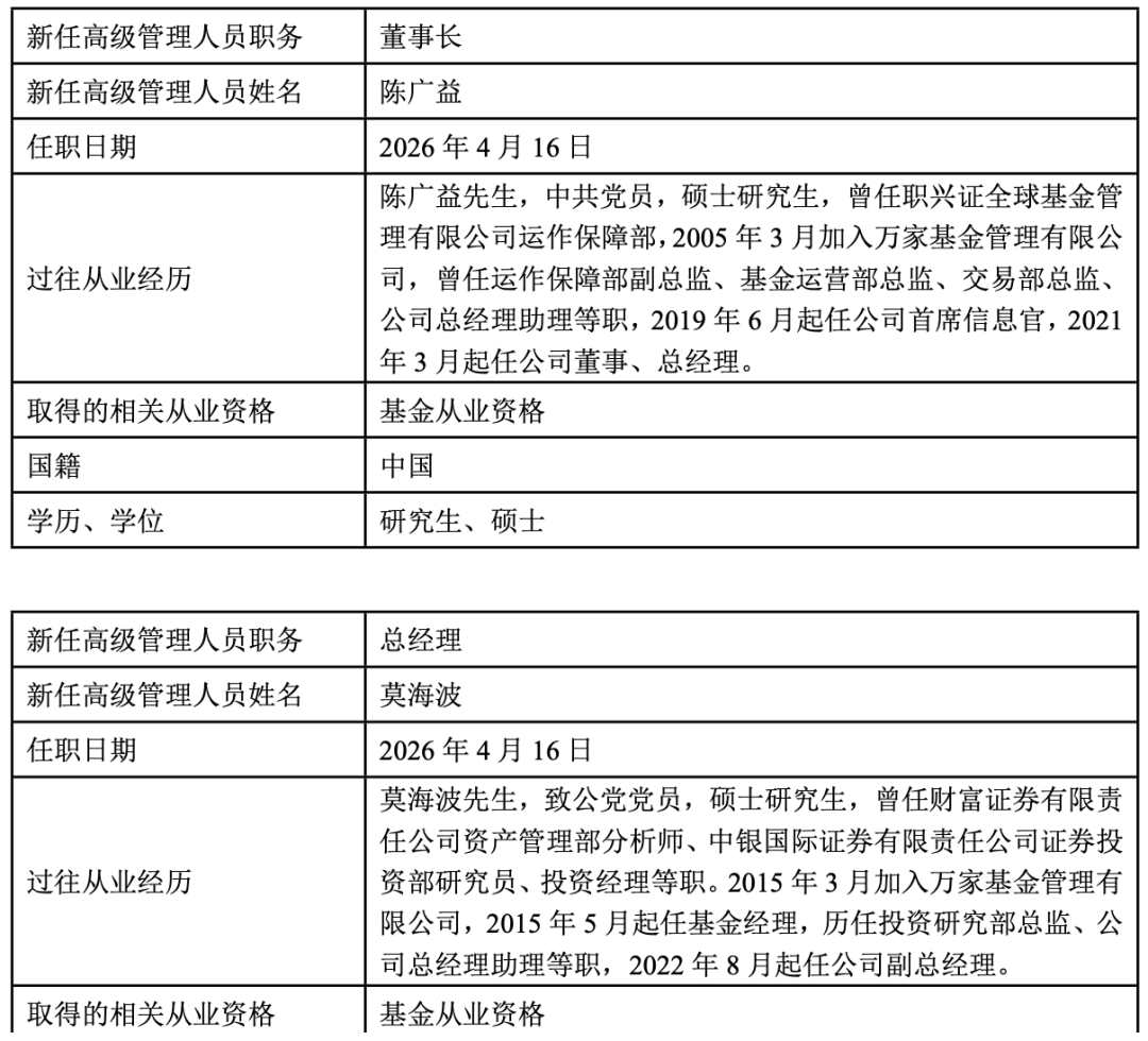 4月17日,萬家基金公告,董事長(zhǎng)方一天正式離職,總經(jīng)理陳廣益接任董事長(zhǎng)職務(wù),副總經(jīng)理莫海波升任公司總經(jīng)理。