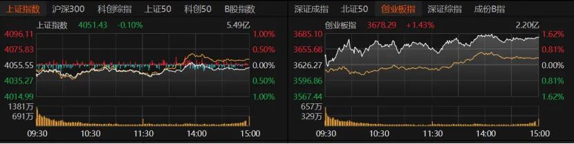 滬指微跌0.1%報(bào)4051.43點(diǎn),創(chuàng)業(yè)板指收漲1.43%報(bào)3678.29點(diǎn),深證成指收漲0.6%。北證50大漲4.77%,科創(chuàng)50微漲0.08%,滬深300微跌0.17%,上證50跌近1%。
