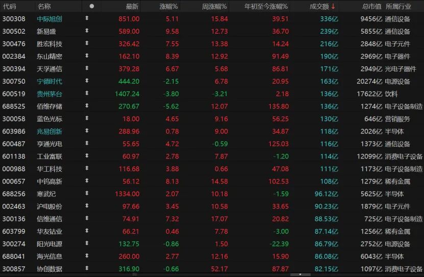 指數(shù)表現(xiàn)不錯(cuò),但個(gè)股跌多漲少,共計(jì)2396只個(gè)股收漲,漲停股76只;2986只個(gè)股收跌,跌停股7只。14只個(gè)股日成交額超過100億元,CPO概念龍頭股“易中天”(中際旭創(chuàng)、新易盛、天孚通信)繼續(xù)大漲:中際旭創(chuàng)收漲5.11%報(bào)851元/股,新易盛收漲9.58%報(bào)589元/股,天孚通信收漲6.67%報(bào)379.28元/股。但寧德時(shí)代回調(diào)2.15%報(bào)444.2元/股,佰維存儲(chǔ)收跌5.62%。