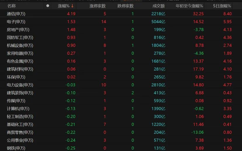 通信、電子、軍工、機(jī)械設(shè)備、有色表現(xiàn)不錯(cuò)。