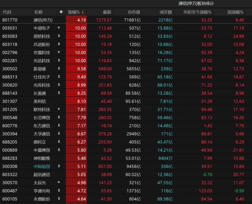 今日通信板塊再度領(lǐng)漲,4月以來12個(gè)交易日累計(jì)漲近25%。個(gè)股方面,中瓷電子、劍橋科技、共進(jìn)股份、世嘉科技、光迅科技5股漲停。