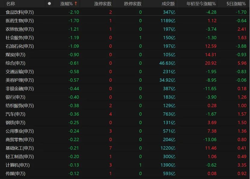 板塊跌多漲少,食品飲料領(lǐng)跌,醫(yī)藥生物、農(nóng)林牧漁、社會(huì)服務(wù)、石油石化板塊跌幅超過1%。